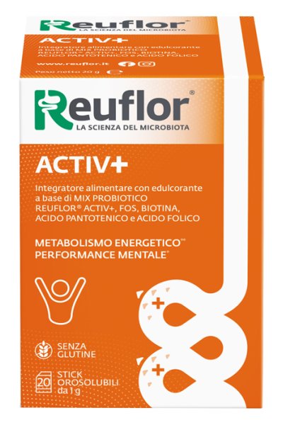 Integratore alimentare a base di mix probiotico Reuflor Activ+ (Bifidobacterium animalis subsp. lactis BLC1, Lactobacillus paracasei IMC502, Lactobacillus rhamnosus IMC 501, Lactobacillus paracasei NTU 101) che contribuisce all'equilibrio della flora intestinale.