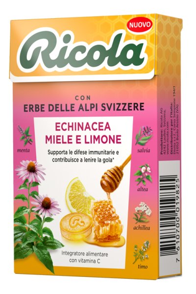 Contiene la tradizionale miscela di 13 erbe Ricola, miele, limone ed echinacea.