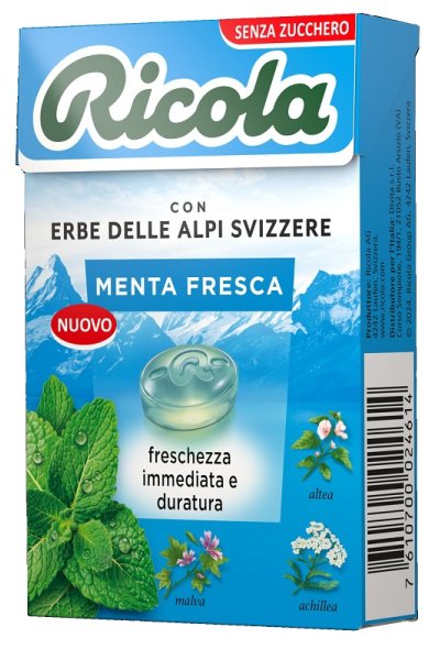 Edulcorante (isomalto), estratto (0,4%) di menta piperita e della miscela di 13 erbe Ricola, olio di menta piperita, mentolo, estratto di spirulina, aroma naturale, edulcorante (glicosidi steviolici da stevia).