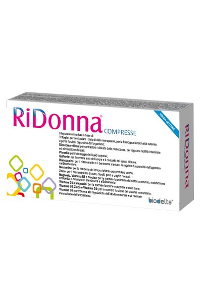Integratore alimentare a base di trifoglio rosso, biancospino, sioscorea, pilosella, griffonia, zinco, magnesio, boro, vitamina B6, vitamina D3, niacina e melatonina. L'equilibrato dosaggio degli ingredienti di RiDonna compresse, con un opportuno regime dietetico ed un corretto stile di vita, è utile per tutto il periodo della menopausa. In questa delicata fase della vita, che pur rientra nel normale processo fisiologico, le alterate situazioni metaboliche spesso possono portare a disturbi quali ansia, disturbi del sonno, irritabilità e vampate di calore, il tutto favorito anche da un calo della serotonina che a volte si accompagna a gonfiore addominale, difficoltà digestive, ritenzione idrica ed aumento di peso. RiDonna compresse, quindi, è un integratore con principi vegetali specifici per attenuare le conseguenze dello squilibrio ormonale in menopausa promuovendo il benessere psico-fisico.