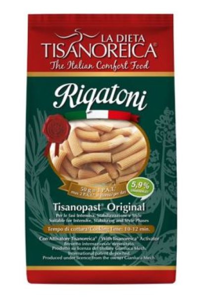 Preparazione alimentare a forma di rigatoni con ridotto apporto di carboidrati (5,90%) e un elevato tenore in proteine (44%), di cui il 61% dalle proteine di soia (NO OGM) IP (Identity Preserve), ovvero a filiera controllata, per avere il massimo valore nutrizionale e un’ottima palatabilità.
