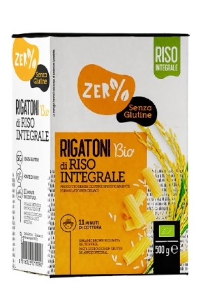 Pasta di riso semigreggio, formato rigatoni senza glutine da agricoltura biologica.Il riso semigreggio è il riso comunemente chiamato integrale, ovvero liberato dalla lolla, il rivestimento più esterno del chicco non commestibile.