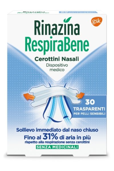 Dispositivo medico.Cerottini nasali trasparenti per pelli sensibili. Sollievo immediato dal naso chiuso. Fino al 31% di aria in più rispetto alla respirazione senza cerottini.