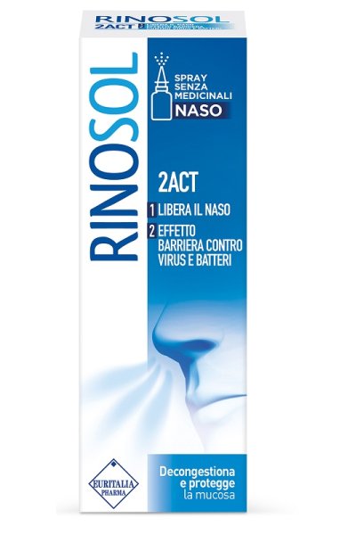 Il dispositivo medico Rinosol 2ACT è uno spray nasale senza propellente pronto all’uso. Per un utilizzo corretto è necessario rimuovere il tappo e, tenendo sia il capo che il flacone in senso verticale, introdurre l’apertura del beccuccio erogatore all’interno della narice, senza affondare eccessivamente all’interno della cavità nasale. Premere con due dita sulla base dell’erogatore ed inspirare contemporaneamente alla fuoriuscita della soluzione. Per facilitare la comprensione del corretto utilizzo del prodotto, la corretta modalità d’uso è riportata anche in forma grafica. Per favorire una distribuzione omogenea del prodotto è utile massaggiare lievemente il naso dall’esterno con movimenti longitudinali dal basso verso l’alto. Al primo utilizzo, per eliminare l’aria dall’erogatore, premere più volte fuori dalle narici. Agitare il flacone prima dell’uso. L’applicazione sui bambini deve essere effettuata da un adulto. Dopo l’uso sciacquare con acqua corrente il beccuccio erogatore e asciugarlo prima di richiuderlo utilizzando l’apposito tappo.