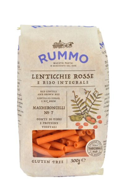Pasta a base di lenticchie rosse e riso integrale, prodotto specificamente formulato per persone intolleranti al glutine, lavorata a vapore. É fonte di proteine vegetali e povera di grassi saturi e, grazie anche alle fibre del riso integrale, rappresenta un alimento completo.