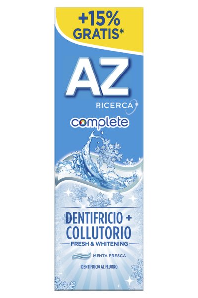 Il dentifricio AZ Complete Fresh & Whitening con collutorio pulisce anche le zone difficili da raggiungere. Contiene due tipi di particelle sbiancanti che rimuovono delicatamente le macchie e aiutano a mantenere il bianco naturale dei denti, rinfrescando l’alito grazie al piacevole sapore di menta fresca.