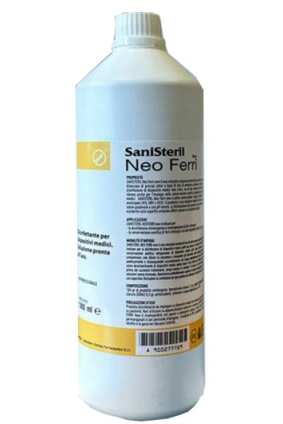 Grazie a una miscela bilanciata di principi attivi a base di di sali di ammonio quaternari, Sanisteril NeoFerri ha una spiccata azione disinfettante, germicida, battericida e fungicida. La formulazione del prodotto non manifesta azione ossidante sulle superfici evitando effetti corrosivi sui materiali sensibili. Il prodotto è una soluzione limpida di colore azzurro con leggero odore e con pH neutro.