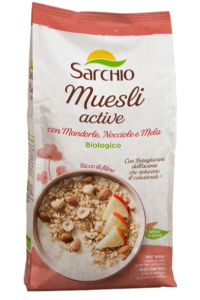 Muesli biologico con mandorle, nocciole e mela. Contiene betaglucani dell'avena che riducono il colesterolo. Prodotto ricco di fibre.