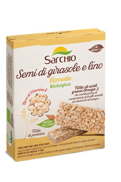 Barrette di semi di girasole e lino. Prodotto specificatamente formulato per persone intolleranti al glutine. Fonte di acidi grassi Omega 3, che contribuiscono al mantenimento di livelli normali di colesterolo nel sangue. Adatto a vegani.