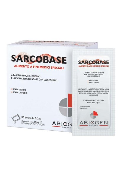 Alimento a fini medici speciali a base di L-leucina, omega 3 e Lactobacillus paracasei con edulcoranti, indicato per la gestione dietetica della sarcopenia e di condizioni caratterizzate da decadimento muscolare, per le quali la terapia nutrizionale con SARCOBASE può favorire il mantenimento e/o il recupero della forza e della massa muscolare.