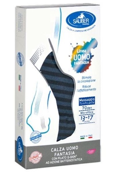 Calze uomo fantasia a compressione graduata in filato Q-SKIN, ad azione batteriostatica per facilitare la traspirazione della pelle e ridurre la sudorazione del piede. Possono essere abbinate sia ad un look classico ed elegante, sia ad un abbigliamento casual e giovanile. Ideali per essere indossate in qualunque occasione, dal lavoro al tempo libero, fino all’occasione speciale. Realizzate con polsino morbido che non stringe, e con punta e tallone in tinta unita.