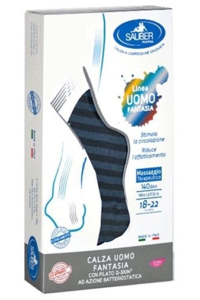 Calze uomo fantasia a compressione graduata in filato Q-SKIN, ad azione batteriostatica per facilitare la traspirazione della pelle e ridurre la sudorazione del piede. Possono essere abbinate sia ad un look classico ed elegante, sia ad un abbigliamento casual e giovanile. Ideali per essere indossate in qualunque occasione, dal lavoro al tempo libero, fino all’occasione speciale. Realizzate con polsino morbido che non stringe, e con punta e tallone in tinta unita.