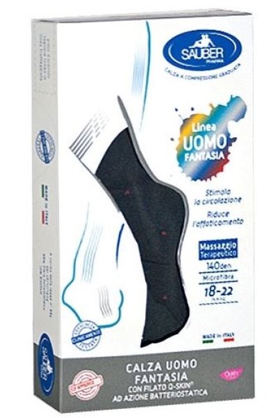 Calze uomo fantasia a compressione graduata in filato Q-SKIN, ad azione batteriostatica per facilitare la traspirazione della pelle e ridurre la sudorazione del piede. Possono essere abbinate sia ad un look classico ed elegante, sia ad un abbigliamento casual e giovanile. Ideali per essere indossate in qualunque occasione, dal lavoro al tempo libero, fino all’occasione speciale. Realizzate con polsino morbido che non stringe, e con punta e tallone in tinta unita.