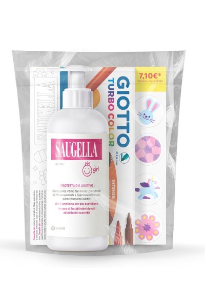 Bundle composto da Saugella Girl, cartoncino, sticker, etichetta adesiva da colorare e una scatola di pennarelli Giotto.