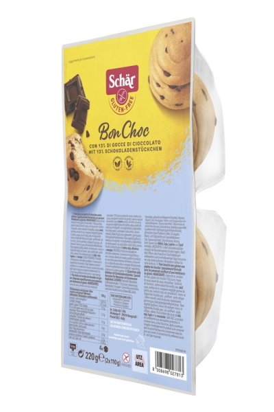 Farina di riso, amido di mais, gocce di cioccolato 13% (zucchero, pasta di cacao, burro di cacao; emulsionante: lecitina di girasole; aroma naturale di vaniglia), acqua, uovo, zucchero, amido di riso, margarina vegetale (grasso di palma, acqua, olio di colza, sale; emulsionante: mono- e digliceridi degli acidi grassi; acidificante: acido citrico; aroma naturale), sciroppo di glucosio; addensanti: gomma di guar, idrossipropilmetilcellulosa; fibra vegetale (psillio), lievito; emulsionante: mono- e digliceridi degli acidi grassi; acidificante: acido citrico, aroma.