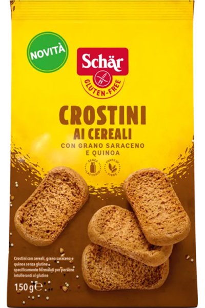 Crostini ai cereali preparati con grano saraceno e quinoa, fonte di fibre senza glutine, senza frumento, senza lattosio, senza olio di palma e senza conservanti.