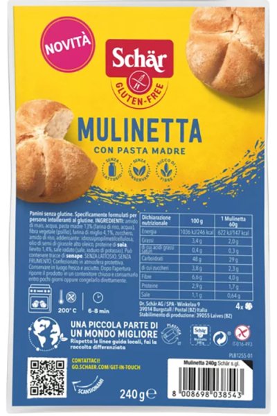 Amido di mais, acqua, pasta madre (farina di riso, acqua) 13%, fibra vegetale (psillio), farina di miglio 4,1%, zucchero, amido di riso; addensante: idrossipropilmetilcellulosa; olio di girasole alto oleico, proteine di soia, lievito, sale iodato (sale, ioduro di potassio).