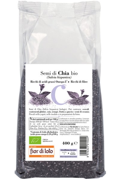 Semi di Chia biologici a bassissimo contenuto di sodio/sale, ricchi di omega-3 e di fibre.