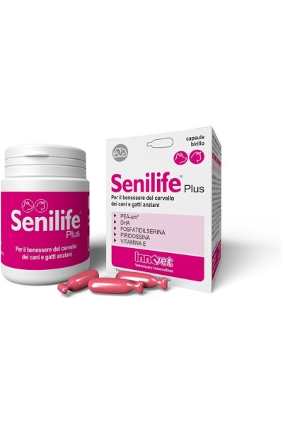 Prodotto utile per migliorare le funzioni cognitive e la memoria di cani e gatti anziani, per un invecchiamento cerebrale di successo. Contiene la PEA (palmitoiletanolamide), una sostanza naturale presente in molte fonti alimentari. Nell’organismo aiuta a mantenere l’equilibrio fisiologico di molti organi e tessuti, cervello compreso. Senilife Plus reintegra le riserve endogene di PEA nella sua forma a più alto assorbimento (ultra- micronizzata, PEA-um). La fosfatidilserina e il DHA sono importanti componenti naturali dei neuroni e ne mantengono la corretta fluidità di membrana. In sinergia con la piridossina, ottimizzano la neurotrasmissione. La vitamina E possiede una funzione antiossidante specifica, neutralizzando i radicali liberi prodotti durante l’invecchiamento cerebrale.