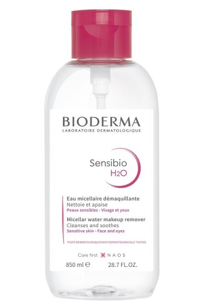 Impregnare un batuffolo di cotone con l'acqua micellare Sensibio H2O.