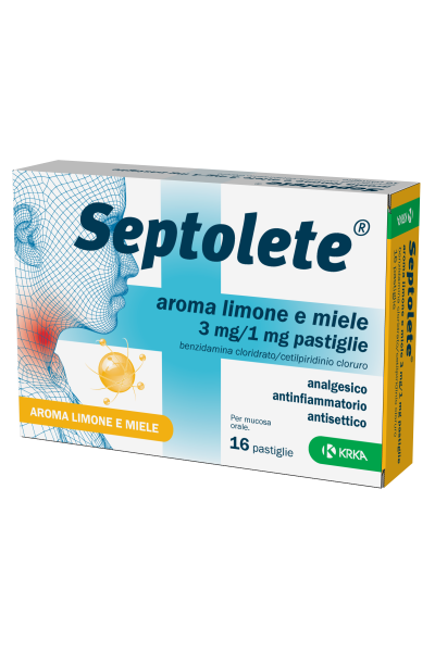 Septolete aroma limone e miele pastiglia è un medicinale antinfiammatorio, analgesico e antisettico per uso orale locale. Septolete aroma limone e miele disinfetta la bocca e la gola e riduce i segni di infiammazione della gola come dolore, arrossamento, gonfiore, calore e funzione alterata.