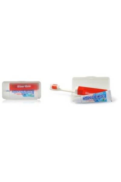spazzolino compatto con setole medie e dentifricio gel ad azione combinata.