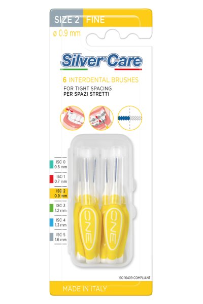 Scovolino interdentale per la pulizia di superfici interprossimali, corone, ponti fissi o apparecchi ortodontici. L’impugnatura ergonomica permette di raggiungere gli spazi tra molari. Il cappuccio igienico può essere utilizzato per allungare l’impugnatura. Misura 2: fine.