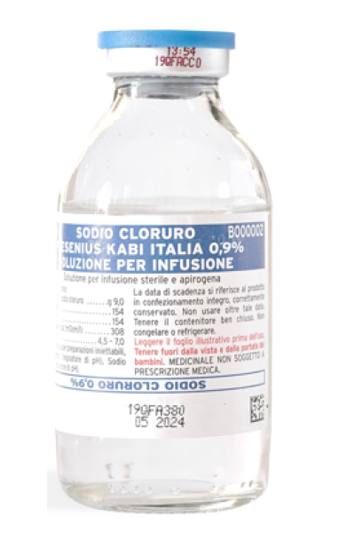AvvertenzeI sali di sodio devono essere somministrati con cautela in pazienti con ipertensione, insufficienza cardiaca, edema periferico o polmonare, funzionalità renale ridotta, pre-eclampsia o altre condizioni associate alla ritenzione di sodio (vedere par. 4.5). Le soluzioni di concentrazione superiore allo 0,9% (soluzioni ipertoniche) devono essere utilizzate con precauzione, a velocità controllata di infusione e solo nei casi in cui siano specificatamente prescritte. Usare con grande cautela in pazienti con scompenso cardiaco congestizio, insufficienza renale grave e in stati clinici in cui esiste edema con ritenzione salina; in pazienti in trattamento con farmaci corticosteroidei o corticotropinici. La somministrazione continua senza aggiunta di potassio può causare ipokaliemia. Usare con cautela nei bambini. Durante l’infusione è buona monitorare il bilancio dei fluidi, gli elettroliti, l’osmolarità plasmatica e l’equilibrio acidobase. La soluzione deve essere limpida, incolore e priva di particelle visibili. Usare subito dopo l’apertura del contenitore. Il contenitore serve per una sola ed ininterrotta somministrazione e l’eventuale residuo non può essere utilizzato.