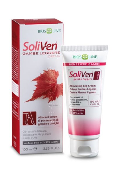 La formula di SoliVen gambe leggere favorisce la fisiologica funzionalità del microcircolo e contribuisce ad alleviare stanchezza e gonfiori, ridonando un piacevole ed immediato senso di benessere e leggerezza alle gambe. Tutto questo in virtù dell’efficacia dei suoi ingredienti erboristici: la Vite rossa in semi, che aiuta a sostenere la circolazione grazie all’elevata concentrazione di Proantocianidine (OPC); l’Ippocastano, il cui estratto di corteccia può restituire tonicità ai vasi e contrastare i gonfiori alle gambe; il Rusco, i cui principi attivi (le ruscogenine) svolgono un’azione regolante sulla permeabilità e l’elasticità dei vasi; la Solidago virga aurea, che contribuisce al drenaggio dei liquidi in eccesso.