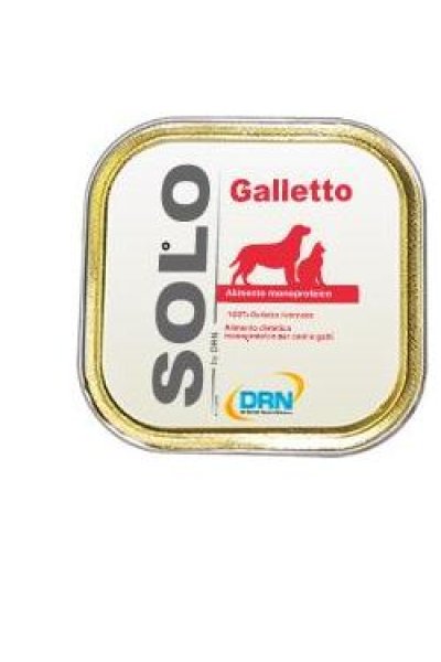 alimento umido monoproteico per cani e gatti contenente proteine ottenute dal galletto livornese, senza coloranti né conservanti, né appetizzanti.