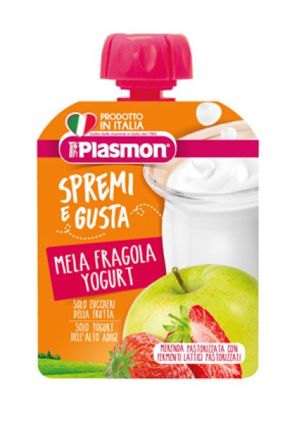 Mela 54% (succo* e purea), yogurt (latte) 20%, fragola 20%, amido di tapioca, panna, lattato di calcio, succo di limone concentrato.