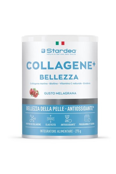 Collagene marino idrolizzato di tipo I (pesce); aroma: melagrana (maltodestrine, amido modificato); acerola e.s. tit. 25% in vitamina C (Malpighia glabra L. frutto, maltodestrine), olio di enotera (Oenothera biennis L. olio, amido modificato, maltodestrine; agente antiossidante: tocoferolo), succo di melagrana in polvere (Punica granatum L., maltodestrine), polvere di barbabietola (Beta vulgaris L.), ialuronato di sodio, biotina (vitamina B8).