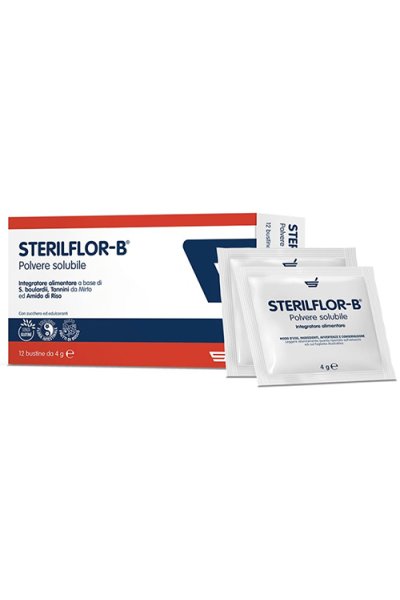 Sterilflor-B è un integratore alimentare a base di tannini da mirto (titolato al 30%), amido di riso e saccharomyces boulardii, utile per favorire l'equilibrio della flora intestinale. Grazie al gusto frutti di bosco, Sterilflor-B ha un sapore gradevole, è senza glutine e privo di conservanti ed è somministrabile sin da 1 anno di età*.