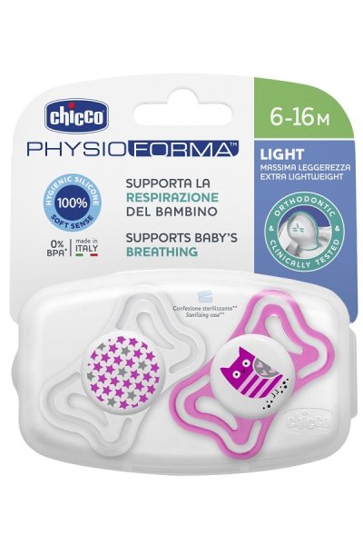 Il succhietto PhysioForma Light Chicco 6-16 mesi con tettarella in silicone è pensato per offrire al bambino la massima leggerezza unita ad un nuovo design. Il succhietto Chicco PhysioForma Light 6-16 mesi in silicone, grazie alla sua esclusiva forma, favorisce il corretto sviluppo della bocca e aiuta a posizionare la lingua in avanti supportando la respirazione fisiologica. Chicco PhysioForma Light 6-16 mesi è in silicone, materiale scelto per la sua praticità, igienico e indeformabile. L’esclusiva finitura Soft Tense lo rende morbido e vellutato.