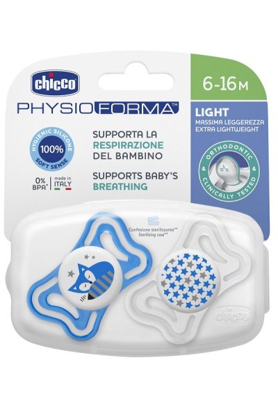 Il succhietto PhysioForma Light Chicco 6-16 mesi con tettarella in silicone è pensato per offrire al bambino la massima leggerezza unita ad un nuovo design. Il succhietto Chicco PhysioForma Light 6-16 mesi in silicone, grazie alla sua esclusiva forma, favorisce il corretto sviluppo della bocca e aiuta a posizionare la lingua in avanti supportando la respirazione fisiologica. Chicco PhysioForma Light 6-16 mesi è in silicone, materiale scelto per la sua praticità, igienico e indeformabile. L’esclusiva finitura Soft Tense lo rende morbido e vellutato.