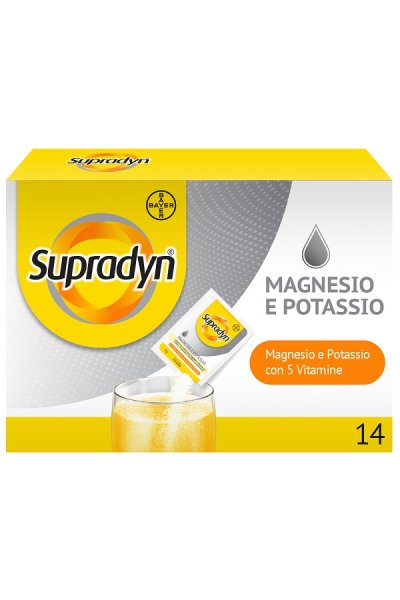Integratore alimentare di vitamine con Magnesio e Potassio con edulcoranti in granulato effervescente gusto arancia. È particolarmente indicato nei casi di aumentato fabbisogno fisiologico o di ridotto apporto con la normale dieta. La sua formula contribuisce a ridurre stanchezza e affaticamento e a mantenere, grazie alla presenza del Magnesio, l’equilibrio elettrolitico/idrosalino. Supradyn Magnesio e Potassio non contiene zucchero e ha un bassissimo contenuto di sale (sodio).Magnesio