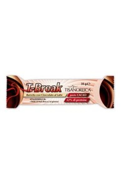 Gustosa barretta con cioccolato al latte gusto cioccolato. Prodotto utilizzabile nella fase Style della Dieta Tisanoreica. T-Break offre un apporto energetico veloce e di lunga durata, ideale per gli sportivi e per chi conduce una vita attiva.Con il 32% di proteine.