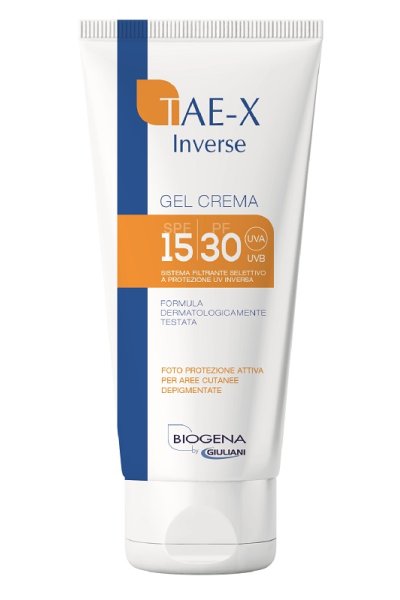 TAE-X Inverse Vitiligo Sun Care è un fotoprotettore attivo per aree cutanee depigmentate. Basato su un innovativo sistema filtrante selettivo a protezione UV Inversa, il nuovo TAE-X Inverse garantisce una protezione media (SPF 15) nel campo UVB e una protezione altissima (UVA PF 30) nel campo UVA svolgendo un'azione coadiuvante nel trattamento elioterapico della vitiligine.