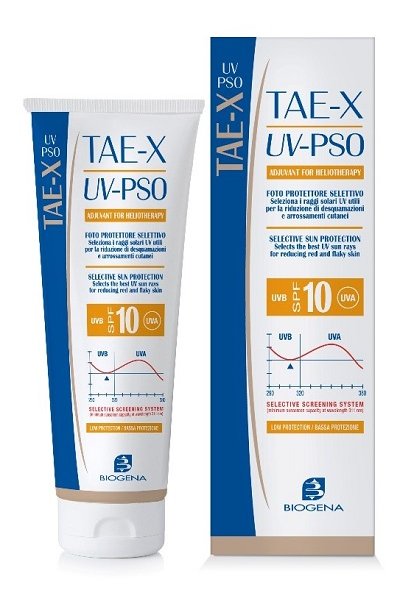 Il Tae-X UV-PSO non è né un farmaco né un prodotto curativo per la psoriasi: è un antisolare concepito per permettre ai pazienti affetti da psoriasi di ottenere i migliori benefici dall'elioterapia Il Tae-X UV-PSO non è consigliato per l'uso come un comune antisolare per tutti perché non garantisce una protezione sufficiente per la pelle sana nella maggior parte delle persone. Il beneficio migliore si otterrà seguendo un programma personalizzato di elioterapia suggerito dallo specialista dermatologo.