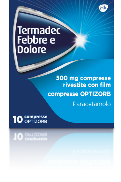 TERMADEC febbre e dolore 500 mg compresse rivestite con film-compresse OPTIZORB, contiene il principio attivo paracetamolo, che agisce come analgesico (allevia il dolore) e antipiretico (riduce la febbre).