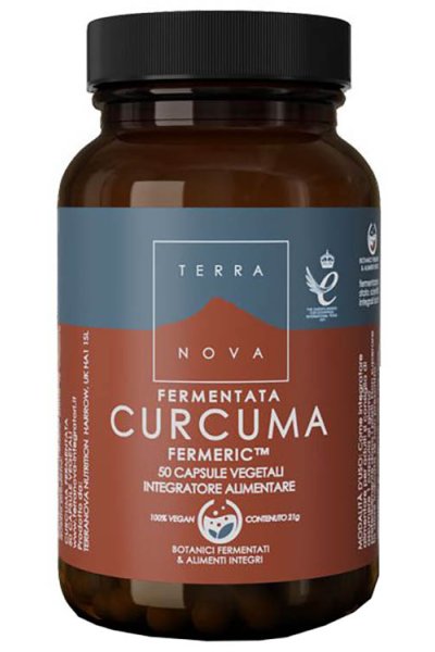 Curcuma fermentata in capsule con ingredienti botanici liofilizzati freschi.