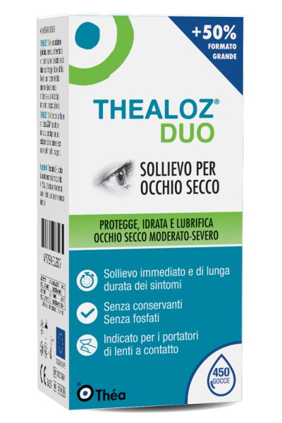 Gli ingredienti principali di THEALOZ DUO sono trealosio e ialuronato sodico. Il trealosio è una sostanza naturale presente in molte piante e animali, che può sopravvivere in condizioni di estrema secchezza. Fornisce proprietà protettive e idratanti. Lo ialuronato sodico, presente nell’occhio umano, trattiene l’acqua per idratare e lubrificare la superficie dell’occhio. Mantiene la soluzione sulla superficie dell’occhio, dando sollievo a lungo e accorciando i tempi di guarigione dell’epitelio corneale.