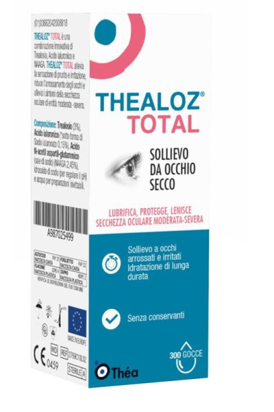 Prodotto da utilizzare solo per un singolo paziente (uso multiplo). In assenza di sufficienti dati, THEALOZ TOTAL non deve essere utilizzato nei bambini, in caso di gravidanza o allattamento con latte materno a meno che non sia consigliato dal medico. Non condividere il flacone con altre persone per evitare contaminazione crociata.