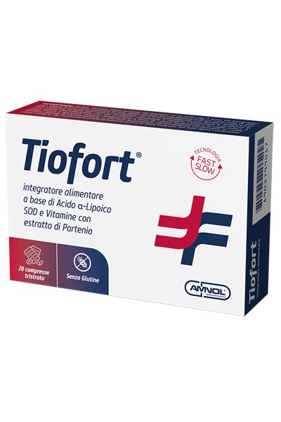 Integratore alimentare a base di acido alfa-lipoico (tiottico), SOD e quercetina, associati ad estratto di partenio. La vitamina C contribuisce alla protezione delle cellule dallo stress ossidativo e, in sinergia alla tiamina e alle vitamine B6 e B12, al buon funzionamento del sistema nervoso. La tecnologia utilizzata nelle compresse di Tiofort per mette una liberazione graduale di acido alfa-lipoico durante l'arco della giornata.