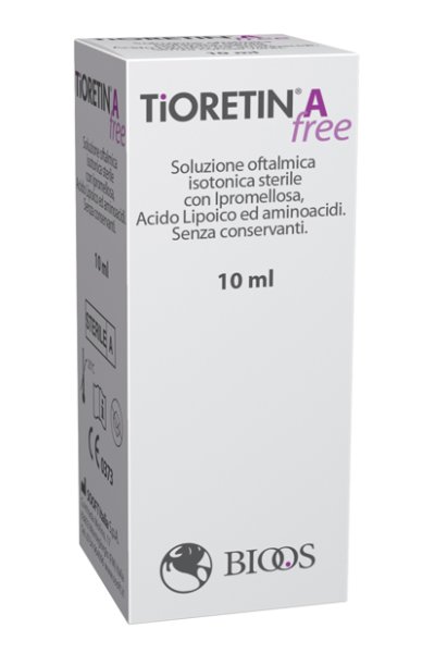 Tioretin A free è una soluzione oftalmica isotonica sterile con Ipromellosa, Acido Lipoico ed aminoacidi, senza conservanti, utile all'integrazione della secrezione lacrimale e al ripristino delle condizioni fisiologiche del film lacrimale.