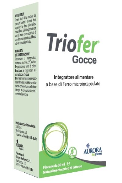 DescrizioneIntegratore alimentare a base di ferro microincapsulato, formulato per colmare le carenze alimentari o in caso sia necessario un aumentato apporto giornaliero di ferro. Il ferro contribuisce alla normale formazione di globuli rossi e dell'emoglobina e al corretto trasporto di ossigeno nell'organismo. Contribuisce al corretto sviluppo cognitivo dei bambini, al normale funzionamento del sistema immunitario e per ridurre stanchezza e affaticamento. Il ferro di Triofer Gocce è microincapsulato e in grado di superare indenne l'ambiente gastrico ed essere altamente assorbito a livello intestinale, migliorando così la tollerabilità gastrica di tale nutriente.
