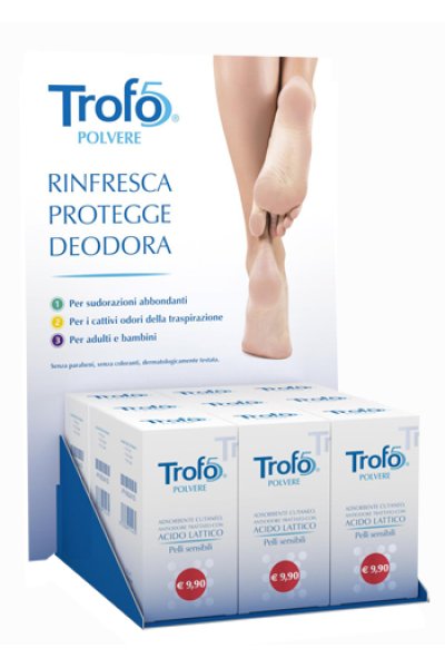 Miscela di polveri, trattata con acido lattico e arricchita con idrossido di alluminio e amido di mais. Trofo 5 polvere, grazie alle sue caratteristiche formulative, svolge varie azioni complementari: adsorbente, antitraspirante, antiodore ed emolliente. Svolge la funzione deodorante per "adsorbimento" e non per profumazione. Protegge da sensazioni sgradevoli in particolari aree cutanee, come le ascelle, le pieghe cutanee, l'area perianogenitale, le zone interdigitali dei piedi, che possono essere alterate da sfregamenti, attrito e condizioni di notevole sudorazione. Particolarmente indicata per neonati, bambini, adulti, soggetti incontinenti e/o lungodegenti, predisposti all'obesità, sportivi. Per pelli sensibili. Dermatologicamente testato. Non contiene profumo.