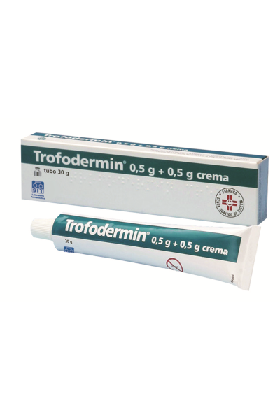 EccipientiTrofodermin 500 mg/100 g + 500 mg/100 g crema Stearato di polietilenglicole; acido stearico; paraffina liquida; lanolina; dimeticone; nipasept (metile para–idrossibenzoato, etile para–idrossibenzoato e propile para–idrossibenzoato); floranol; acqua depurata. Trofodermin 5 mg/ml + 5 mg/ml spray cutaneo, sospensione Magnesio stearato; paraffina liquida; isobutano a 3,2 bar.