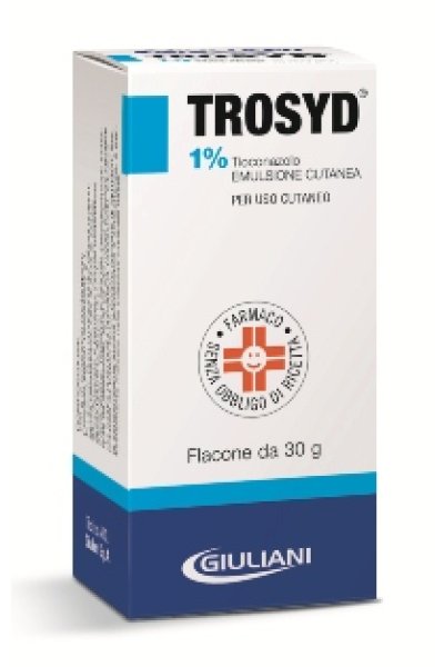 Posologia1% Crema – 1% Polvere – 1% Emulsione cutanea TROSYD va applicato mediante un leggero massaggio due volte al giorno, mattina e sera, sulla cute affetta e su quella immediatamente circostante. – Nelle aree di intertrigine TROSYD 1% Crema va applicata in piccole quantità e ben spalmata, per evitare fenomeni di macerazione. – TROSYD 1% Polvere cutanea è disponibile in un contenitore con cui può essere direttamente applicata in uno strato uniforme. – TROSYD 1% Emulsione cutanea va applicata con la punta delle dita e con un tampone di ovatta. La durata del trattamento richiesto per ottenere la guarigione varia da paziente a paziente ed in relazione all’agente infettante e alla sede di infezione. Un trattamento di 7 giorni è di solito sufficiente per ottenere la guarigione nella maggior parte dei pazienti con Pityriasis versicolor, mentre possono essere necessarie fino a 6 settimane di trattamento in caso di gravi forme di Tinea pedis (piede d’atleta), specialmente per quanto riguarda la varietà clinica cronica ipercheratosica. La durata del trattamento richiesto per infezioni dermatofitiche ad altre localizzazioni per Candidiasi ed Eritrasma è di solito compresa tra le 2 e le 4 settimane. Trosyd 28% Soluzione cutanea per uso ungueale: TROSYD va applicato sull’unghia infetta e nella regione periungueale due volte al giorno, mattina e sera, usando l’apposito pennello. Il solvente contenuto in Trosyd asciuga in 5 minuti lasciando una sottile pellicola trasparente ed oleosa. Anche se questa pellicola viene casualmente rimossa ciò non diminuisce l’attività del farmaco, e quindi non è necessario applicarlo di nuovo. Si consiglia di non usare un bendaggio occlusivo. La durata del trattamento richiesto per ottenere la guarigione varia da paziente a paziente, ed è in relazione all’agente infettante e all’estensione della lesione. In genere la terapia può durare in media fino a 6 mesi, ma può essere prolungata fino ad un anno. Trosyd 1% Soluzione cutanea: A contatto con la cute forma una soluzione schiumosa: impiegare la quantità di soluzione necessaria in rapporto alla superficie cutanea da trattare, usando il prodotto come detergente liquido, una volta al giorno, e sciacquare con acqua dopo qualche minuto dall’applicazione. L’uso di TROSYD 1% soluzione cutanea deve essere effettuato insieme a concomitante trattamento antimicotico specifico topico, applicato dopo l’uso della soluzione. La durata del trattamento richiesta per ottenere la guarigione varia in relazione all’agente infettante e alla sede di infezione e di solito è compresa tra le due e le quattro settimane. A giudizio del medico, il trattamento con la soluzione cutanea può essere protratto anche dopo il termine di altre terapie specifiche topiche allo scopo di ridurre il rischio di recidive.