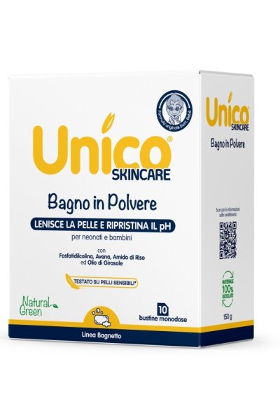 Unico bagno polvere è una composizione a base di amido di riso micronizzato, avena colloidale, lecitina di soia.